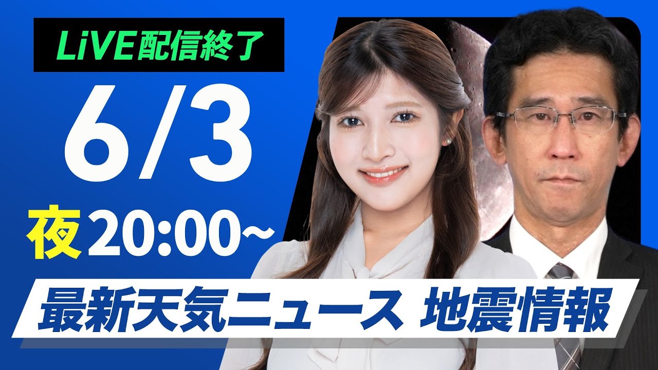 【ライブ】最新天気ニュース・地震情報 2025年6月3日(火)/あす西日本は天気回復 関東は天気急変に注意〈ウェザーニュースLiVEムーン・岡本 結子リサ/山口 剛央〉