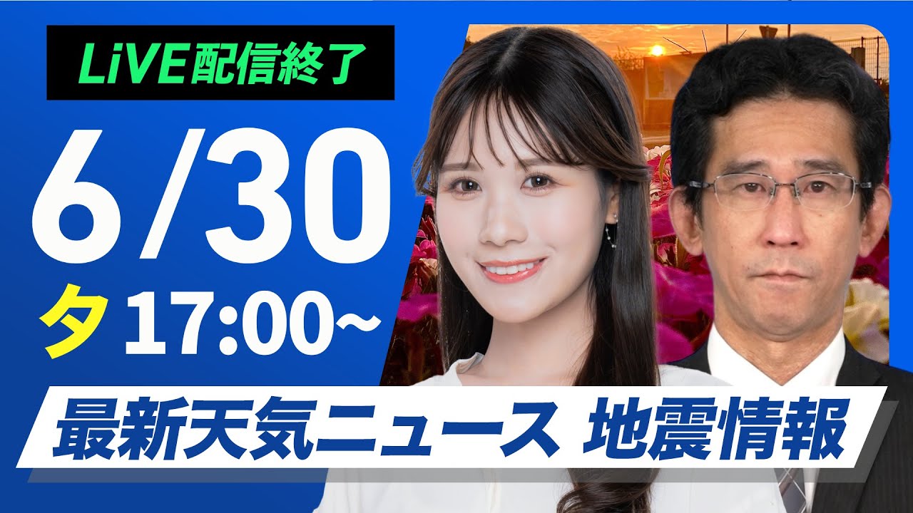 【ライブ配信終了】最新天気ニュース・地震情報 2025年6月30日(月)/明日は関東平野部でも雷雨の可能性〈ウェザーニュースLiVEイブニング・戸北 美月/山口 剛央〉