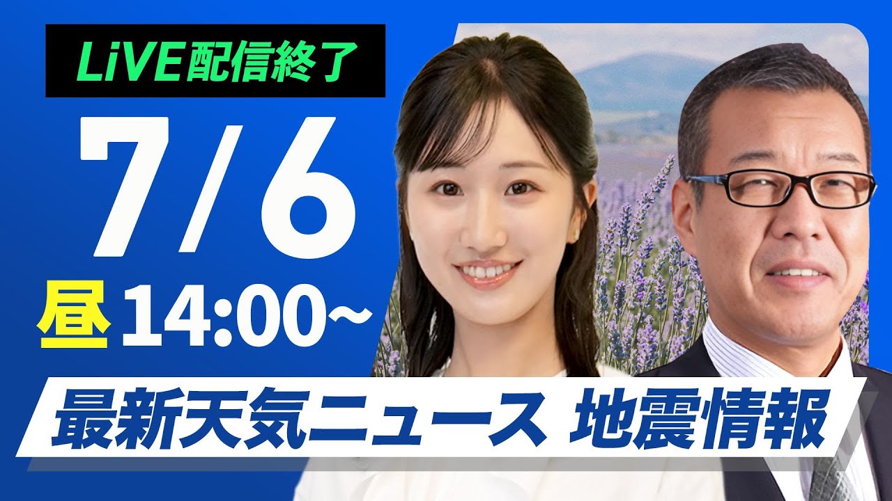 トカラ列島 震度5強が2度連続【ライブ配信終了】最新天気ニュース・地震情報 2025年7月6日(日)/危険な暑さに厳重警戒〈ウェザーニュースLiVEアフタヌーン・田辺真南葉/森田清輝〉