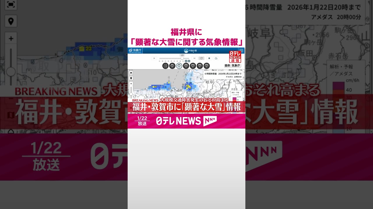 敦賀市新保で22日21時までの6時間に32cmの顕著な降雪が観測されたため、福井地方気象台は、21時23分に「顕著な大雪に関する気象情報」を発表しました。