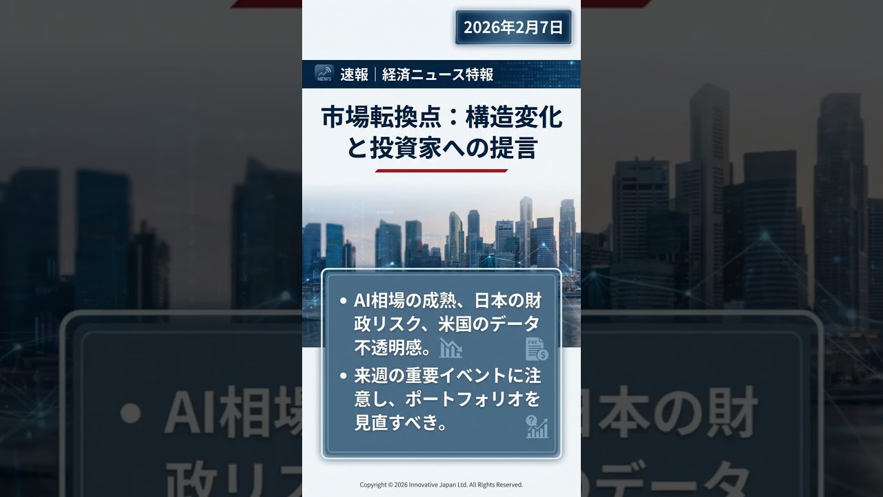 2026年2月6日の最新ニュースをお届けします。このショート動画では、世界の金融市場における歴史的転換点に注目し、AI投資、サナエノミクス、そして市場リスクを2分で解説します。さらに、来週の重要イベントへの準備と投資ポートフォリオの見直しにつながる情報も提供。即座に確認して市場理解を深めましょう!