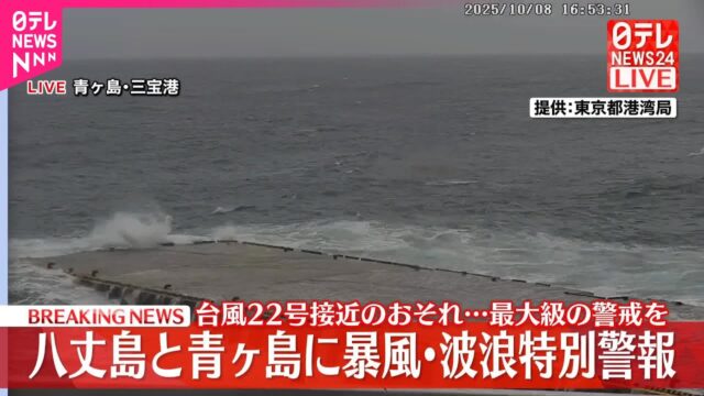 台風22号は9日にかけて非常に強い勢力で伊豆諸島に接近するおそれがあります。気象庁は、先ほど伊豆諸島南部の八丈島と青ヶ島に暴風と波浪の特別警報を出して、最大級の警戒を呼びかけています。