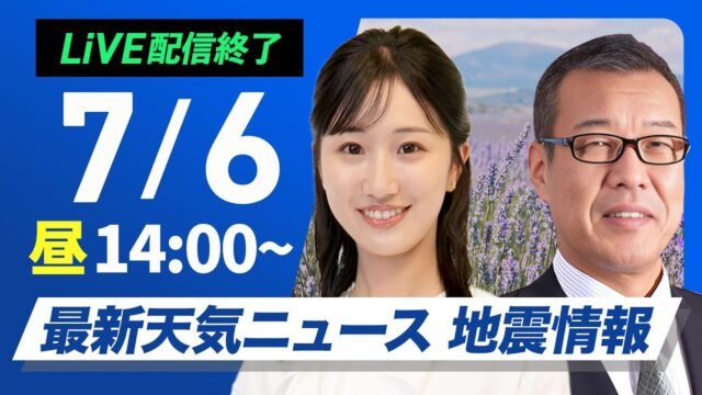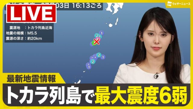 ニュース動画 トカラ列島 震度5強が2度連続【ライブ配信終了】最新天気ニュース・地震情報 2025年7月6日(日)/危険な暑さに厳重警戒〈ウェザーニュースLiVEアフタヌーン・田辺真南葉/森田清輝〉