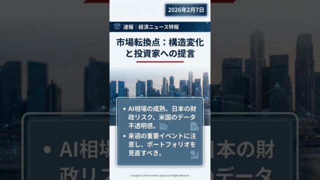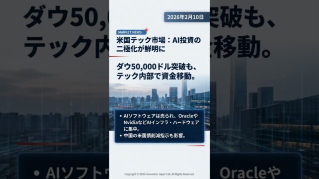 世界の金融市場が変化の中、注目すべき最新ニュースをお届けします。日経平均史上最高値、米国テック市場のAI動向、暗号資産の変化などを2分でまとめて解説しています。SNS向け速報形式で分かりやすくお届けします。