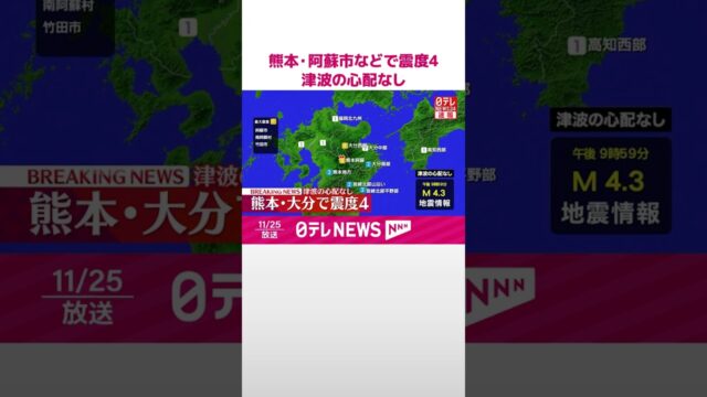 気象庁によると、25日午後9時59分ごろ、地震があった。震源地は熊本県阿蘇地方。震源の深さは10キロ。地震の規模を示すマグニチュードは4.3と推定。この地震による津波の心配なし。 (2025年11月25日放送) この動画の記事を読む>...
