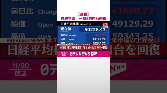 20日朝の東京株式市場で日経平均株価の上げ幅は、1000円以上となり一時5万円台を回復しました。 (2025年11月20日放送) この動画の記事を読む> ◇メンバーシップ「日テレNEWSクラブ」始まりました 月額290円で所属歴に...