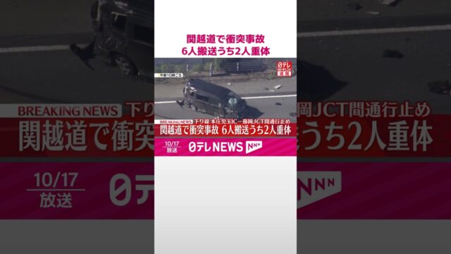 17日朝、埼玉県上里町の関越自動車道の下りで、トラックと乗用車が衝突する事故がありました。6人が病院に搬送され、そのうち2人が意識不明の重体です。